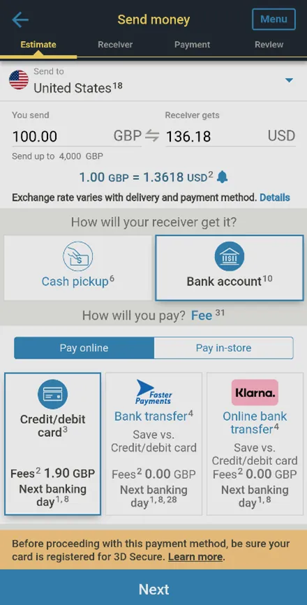 Exchange rates are subject to change. The applicable exchange rate is based on your transfer amount and send and receive methods chosen at the time of transfer. We recommend sending money as soon as you receive the alert.