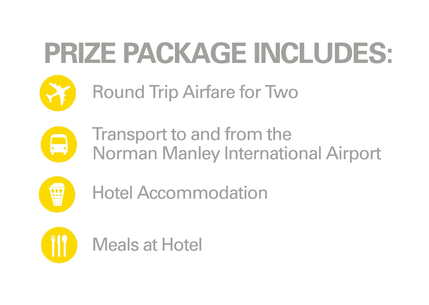 Grand Prize Description: One (1) Grand Prize: A 3 Day/2 Night Trip to Kingston, Jamaica for Grand Prize Winner and one (1) guest to attend the 2017 Inter-Secondary Schools Boys and Girls Championships on April 1, 2017. Prize includes [1] Round trip air economy class transportation for Winner and Guest to/from the major airport closest to Winner’s home and Kingston, Jamaica; [2] Hotel accommodations in one (1) standard double occupancy room for two (2) nights; [3] total meal allowance of US$250 to be used at the hotel [4] Two (2) tickets to the 2017 Inter-Secondary Schools Boys and Girls Championships on April 1, 2017; and [5] Ground transportation to/from the airport in Jamaica and the hotel, and to/from the hotel and event on April 1, 2017 for Grand Prize Winner and Guest. Grand Prize is exclusive of transfers, government taxes and fees, service charges, additional meals, gratuities and other personal expenditures. No substitutions, cash equivalents, or transfers of prizes permitted except at the discretion of the Sponsor. Actual value of prize will vary depending upon Grand Prize Winner’s point of departure and date of travel.