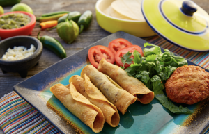 There are two types of flautas: beef and chicken. Flautas are rolled tortillas with shredded beef or chicken inside. It will be deep fried. Once the tortilla is crispy, it is served with chopped cabbage, cilantro, tomato, shredded white cheese, cream and your choice of sauce.