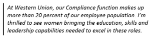 At Western Union, our Compliance function makes up more than 20 percent of our employee population. I’m thrilled to see women bringing the education, skills and leadership capabilities needed to excel in these roles. To support our internship program, we are very fortunate to be able to team up with universities in WU’s hometown of Denver, as well as military placement organizations.