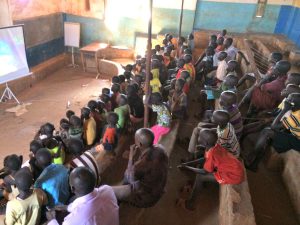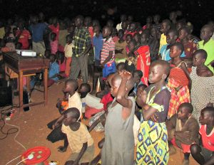 An educational and entertaining component to promote peace through cinema called the Cinema for Peace Program, was launched March 2016 in Kiryandongo gathers an audience of 300 community members. The program originally started in South Sudan in 2014 at the Protection of Civilians site of the United Nations. As a popular media, cinema can be a potent vector of positive values to connect people across ethnicities, nationalities, and languages. WPDI initiated the Cinema for Peace program to draw on the cathartic power of movies with a view to instilling in the audiences, notably children and youth, a capacity to reflect on the conditions of peace and how to achieve them. The program consists in screenings followed by town‐hall meeting style debates to raise awareness on the need for peace and non-violence to prevail over war and conflicts as solutions to human problems. We gather an average of 300 people for each screening‐debate. The project is also available to children through the Cinema for Peace Children’s Program, featuring animated movies followed by drawing exercises.
