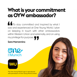 “My commitment is to stay committed and inspired by what I saw and experienced at One Young World. What I mean by that is, it would be so easy to slip back into a normal routine after the summit, return to my bubble. But I can’t ignore the work that needs to be done. I was proud to be a part of the experience and plan on keeping in touch with other ambassadors within Western Union and externally, and on using her privilege for purpose.”