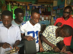 Above Photo: Simon trains other youth in his electronic repair shop in Wakiso, Uganda.