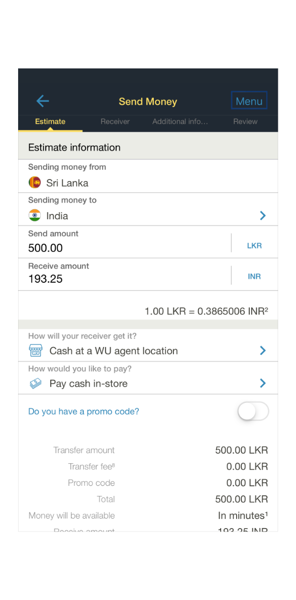 2 Funds may be delayed or services unavailable based on certain transaction conditions, including amount sent, destination country, currency availability, regulatory and foreign exchange issues, required receiver action(s), identification requirements, Agent location hours, differences in time zones, or selection of delayed options. Additional restrictions may apply. See Terms and conditions for details.