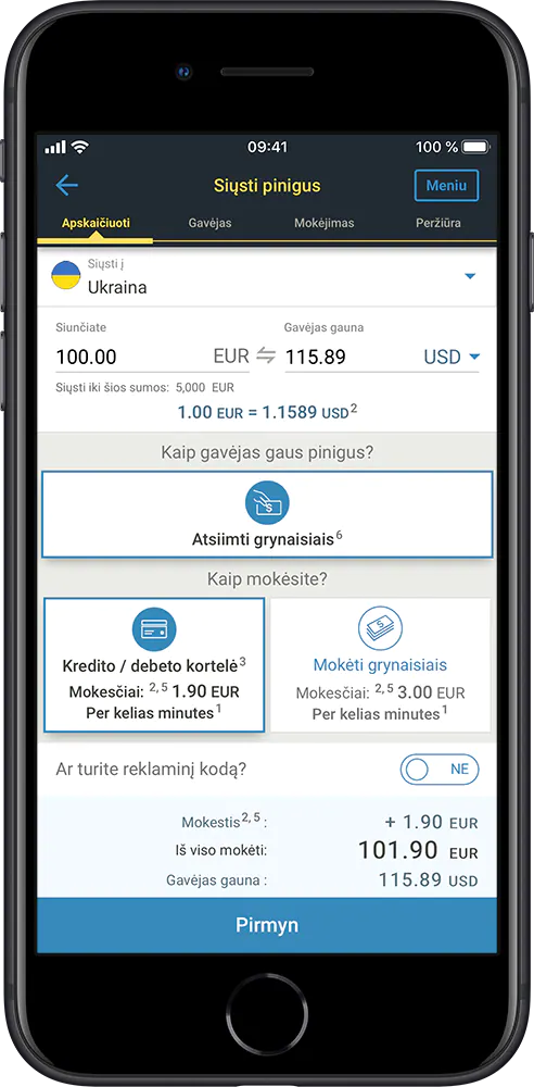 Pinigus iš Lietuvos išsiųsite greitai ir lengvai. Už siuntimą galite sumokėti kredito3 arba debeto kortele, banko pavedimu arba grynaisiais pinigais.